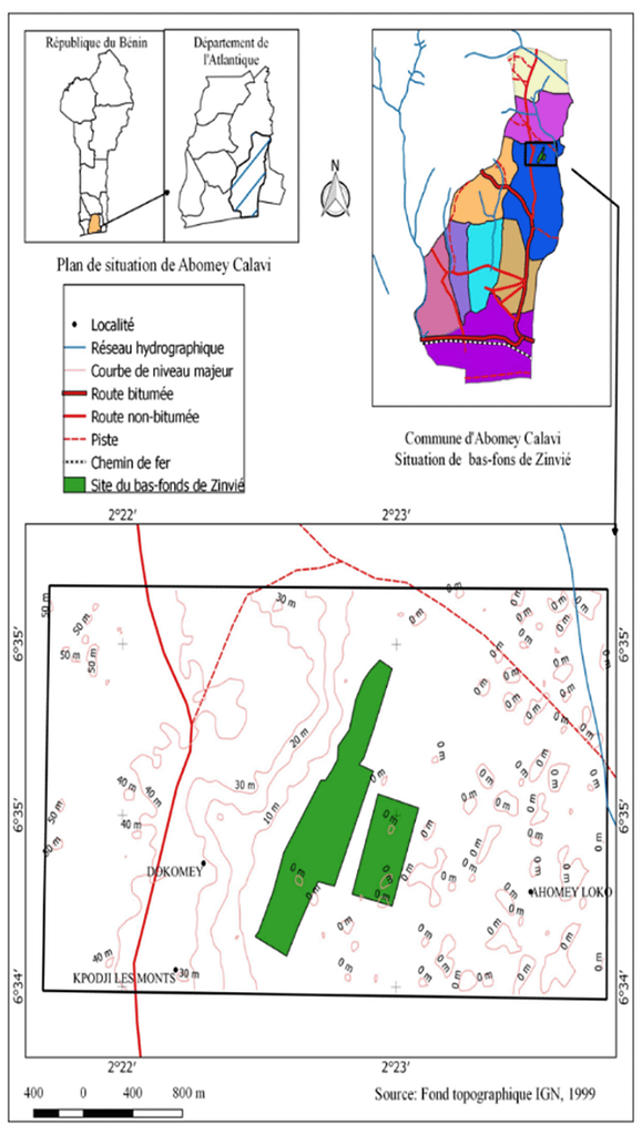 Au Bénin, le territoire où se déroule le programme d’actions est situé sur la Commune d’Abomey-Calavi . Cette Commune se trouve sur deux bassins versants dont près des ¾ de la superficie (433 km2) sont drainés vers le fleuve Ouémé et le reste (166 km2) s’écoule vers le fleuve Zou.